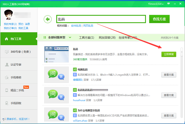 1. 打开安全卫士--功能大全—人工服务,在热门工具页面右侧搜索“乱码”