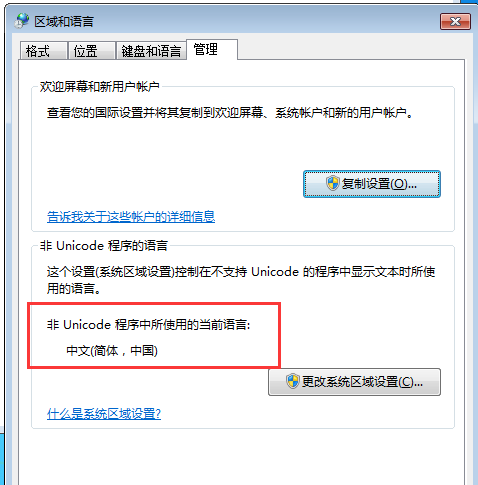 3. 如果不是“中文(简体,中国)”,点击下面“更改系统区域设置”按钮,改为“中文(简体,中国)”;